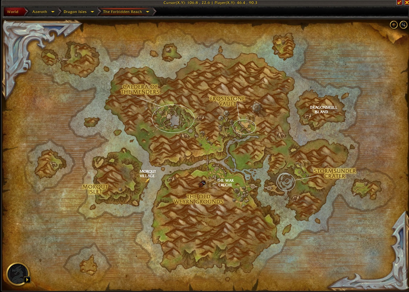 Morqut Village and Dragonskull Island can be flown over to register as discovered. With Caldera of the Menders, Frostone Vault and Stormsunder Crater, you have to fly over the white circles on the map. Flying over the labels that are on the ingame map will not discover these areas. For the War Creche you have to cross the threshold of the entrance. In spite of the illustration on the ingame map this doorway is actually facing North not East.