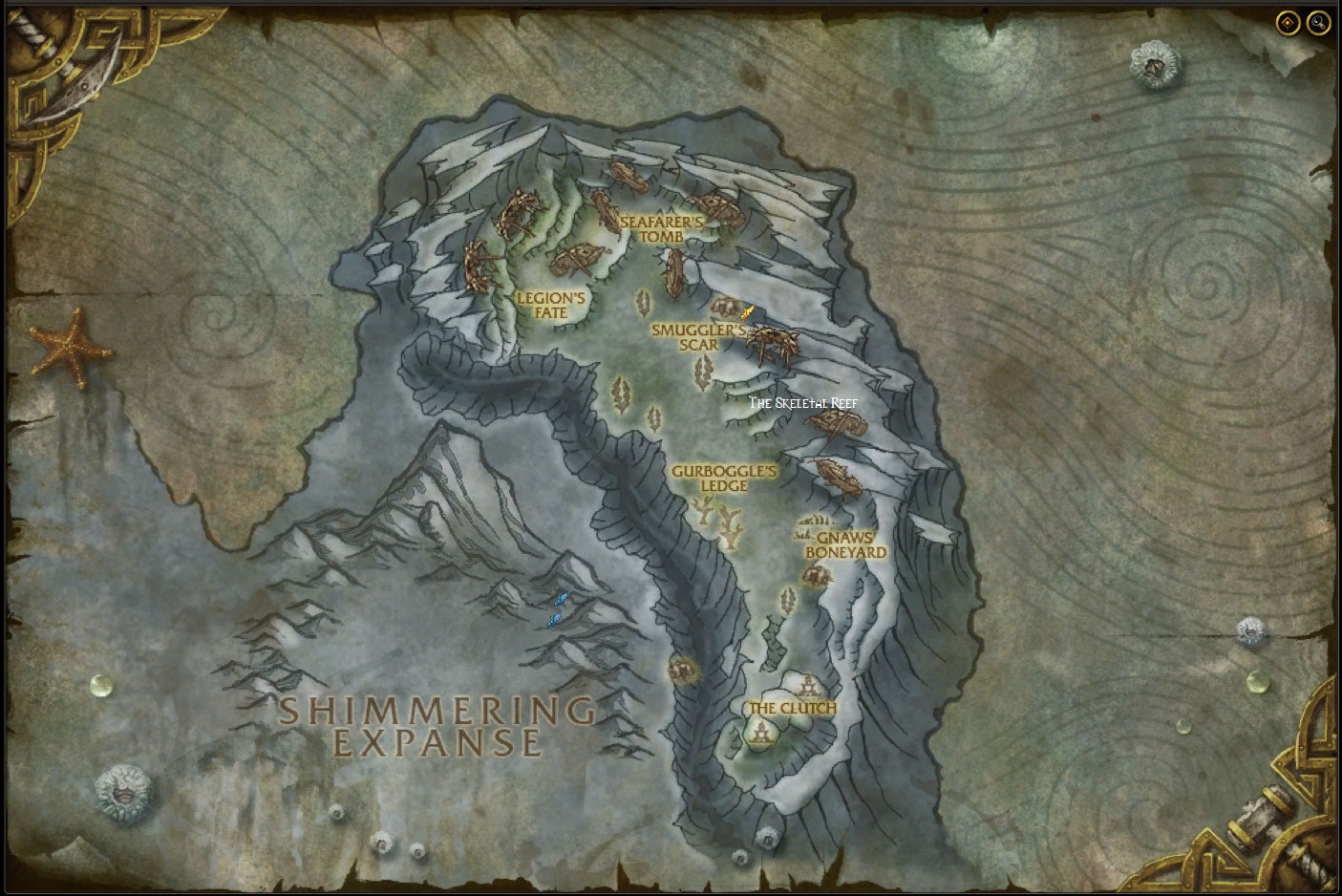 This zone has the following: The Clutch, Gnaws' Boneyard, Gurboggle's Ledge, Legion's Fate, Seafarer's Tomb and The Skeletal Reef.