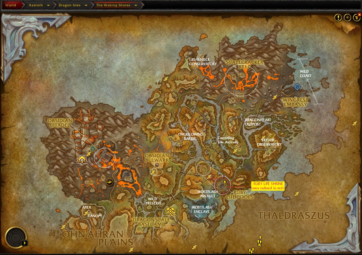 The Ruby Life Shrine (area outlined in red) is completely contained in the Ruby Life Pools area, but doesn't give credit for the achievement. If you take a taxi to the Ruby Life Shrine you won't get credit for discovering Ruby Life Pools. (even though the flightpath at the Ruby Life Shrine is labeled Ruby Life Pools). If you fly there yourself you will have to cross into the Ruby Life Pools area so you will get credit.